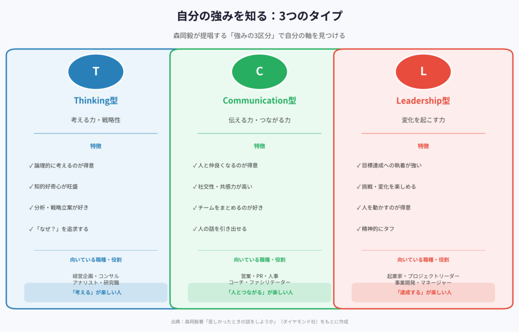 自分の強みを考える際、漠然と考えるのは逆効果です。「T型(考える力)」「C型(つながる力)」「L型(動かす力)」の3つのタイプに絞って分類することで、自分がどの領域で勝負すべきかが明確になります。