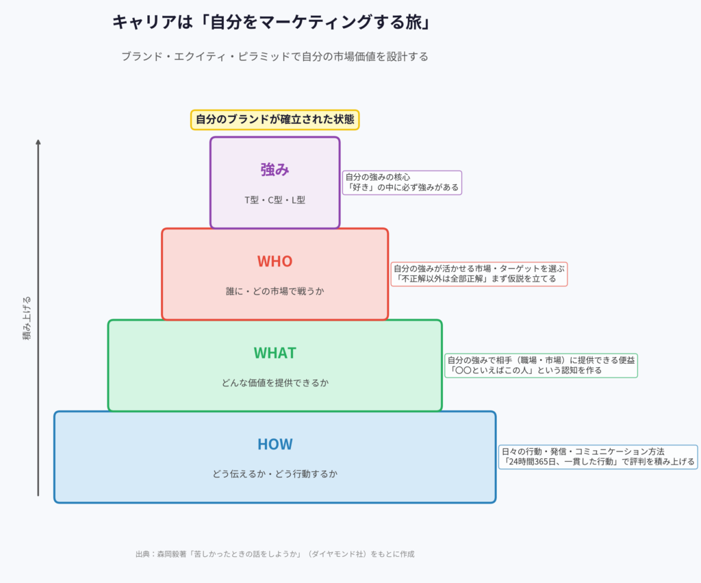 キャリアに迷う最大の原因は、自分の強みと市場のニーズが整理されていないことです。本書では「強み」を土台とし、その上に「WHO(誰に)」「WHAT(何を)」「HOW(どう伝えるか)」を積み上げる「ブランド・エクイティ・ピラミッド」を推奨しています。