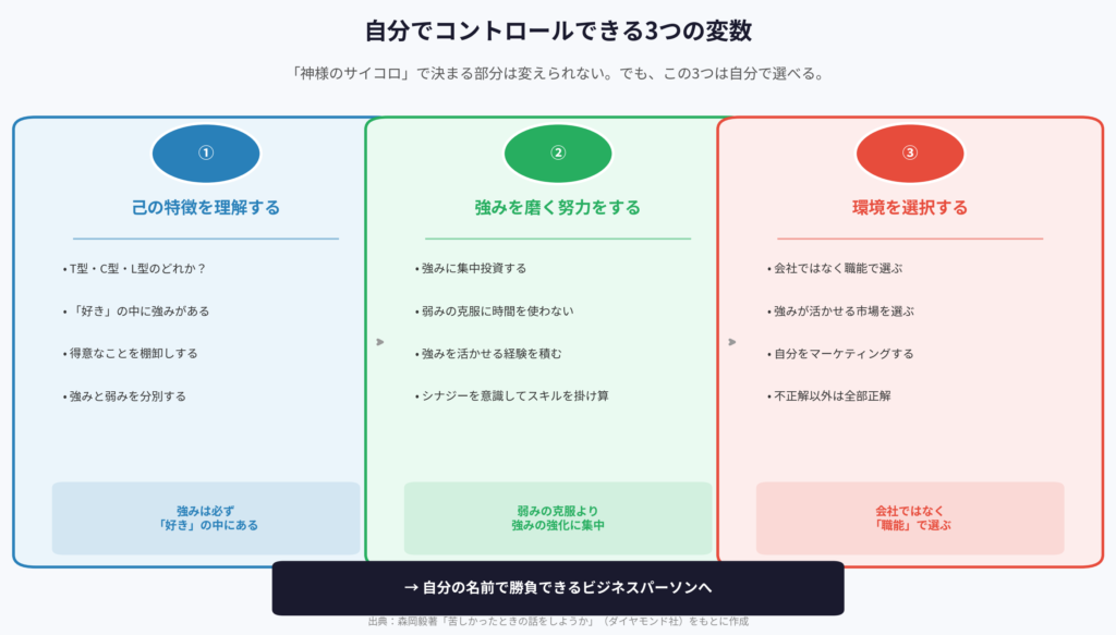 キャリア戦略の目的は「弱みをなくして平均的な人間になること」ではありません。最終的なゴールは「自分の強みで勝負できるビジネスパーソンになること」です。